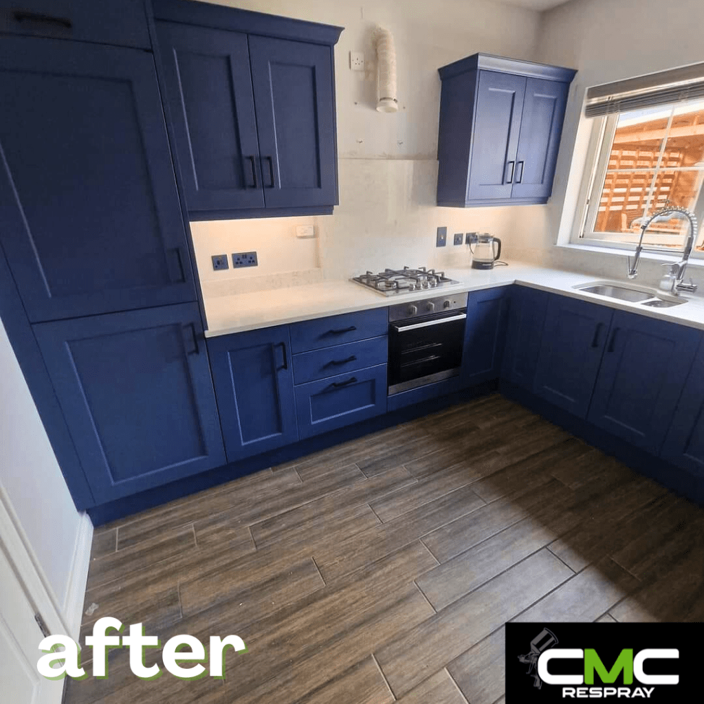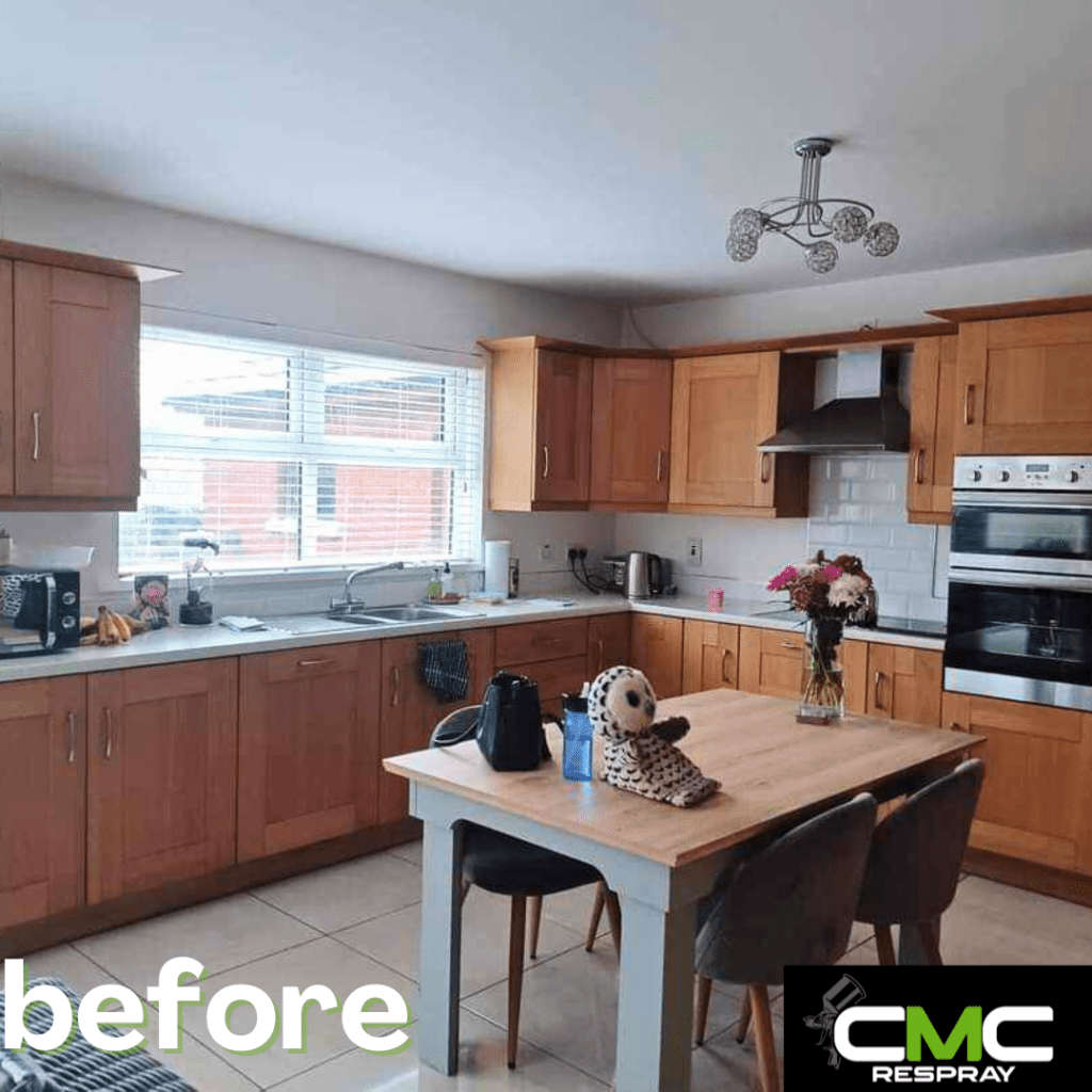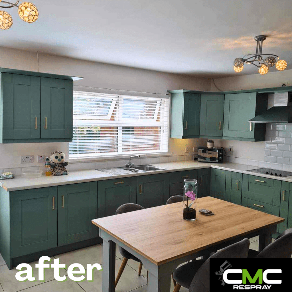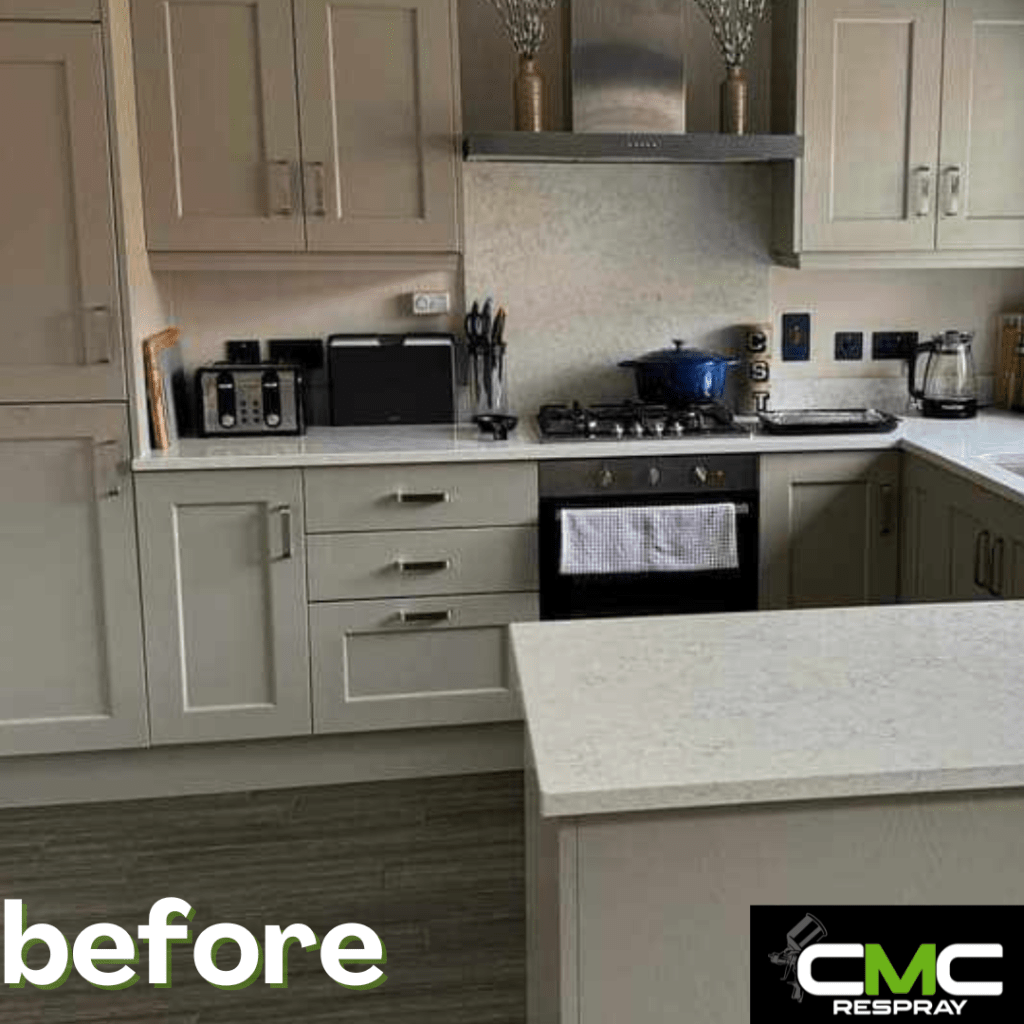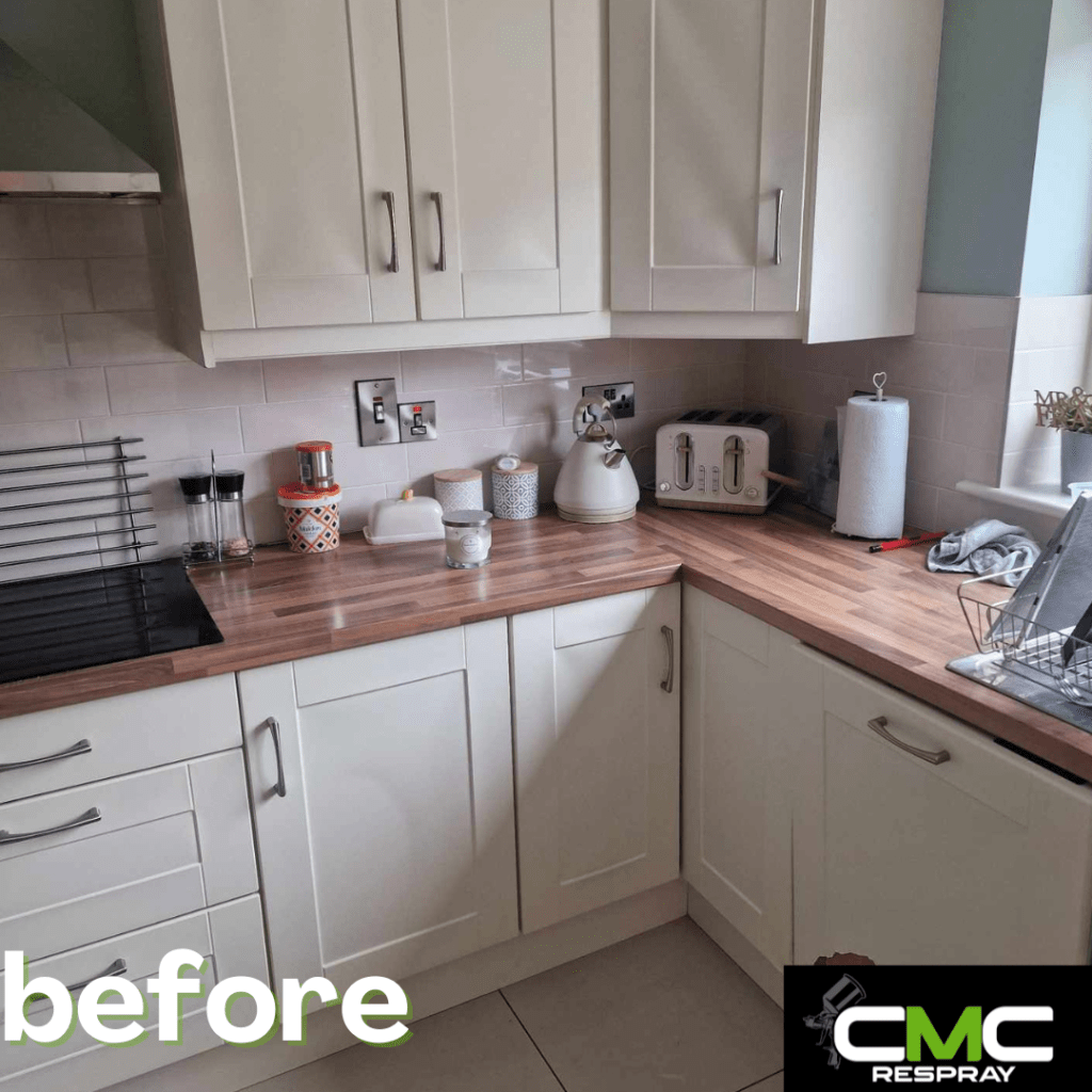 When we spray your kitchen, all surfaces are sprayed — nothing is hand-painted. To carry out the work inside your home, we must mask up surrounding areas. Please note: there is a small possibility that masking tape may remove paint from your walls or damage wallpaper.